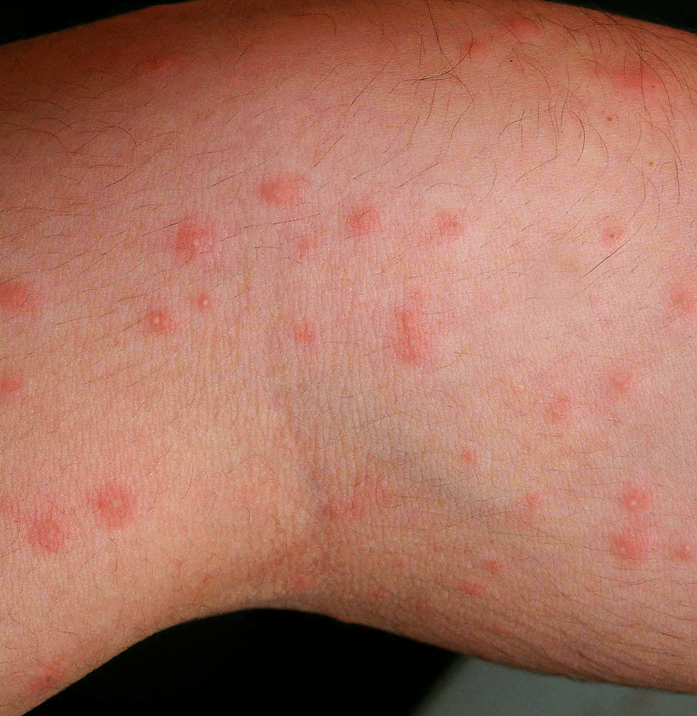 In spring and summer, they are commonly caused by mites developing in worm-eaten furniture, such as Pyemotes ventricosus, causing multiple red, itchy lesions. Throughout the year, various pathogenic arthropods coming from outside (e.g., from birds, rats or garden plants) may invade indoor spaces and cause health troubles.
