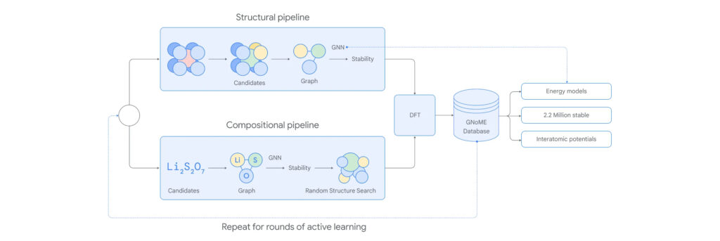 This active learning approach, combined with the functional structure of GNNs, allowed GNoME to explore the vast “chemical space” of possible elemental combinations exponentially more efficiently than exhaustive or random screening, concentrating computational resources on the most promising regions of the search space.