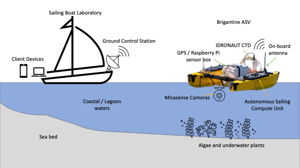 The technological core of the project is the Brigantine-ASV, a modular and cost-effective Autonomous Surface Vehicle conceived to bridge the gap between satellite observations and in situ measurements. The prototype was developed using an open and flexible architecture. This allows the integration of multiple sensors and adaptation to different operational scenarios. Navigation and control rely on open-source solutions, including ArduPilot firmware and an industrial-grade flight controller (Orange Cube+), integrated with a high-precision GNSS receiver capable of centimetre-level positioning accuracy. The platform is equipped with onboard sensors, including an Idronaut Ocean Seven 304 CTD probe for measuring key physico-chemical water parameters, such as conductivity, temperature, and depth. It also includes a single-beam echosounder (Ectos) for shallow-water bathymetric surveys. Advanced remote sensing capabilities are provided by RGB cameras and multispectral sensors (Micasense Altum-PT). These are used to analyse the distribution and health status of submerged vegetation, particularly seagrass meadows.